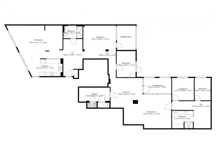 Midden gedeelte: Twee slaapkamers, waarvan één met overdekt terras.