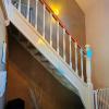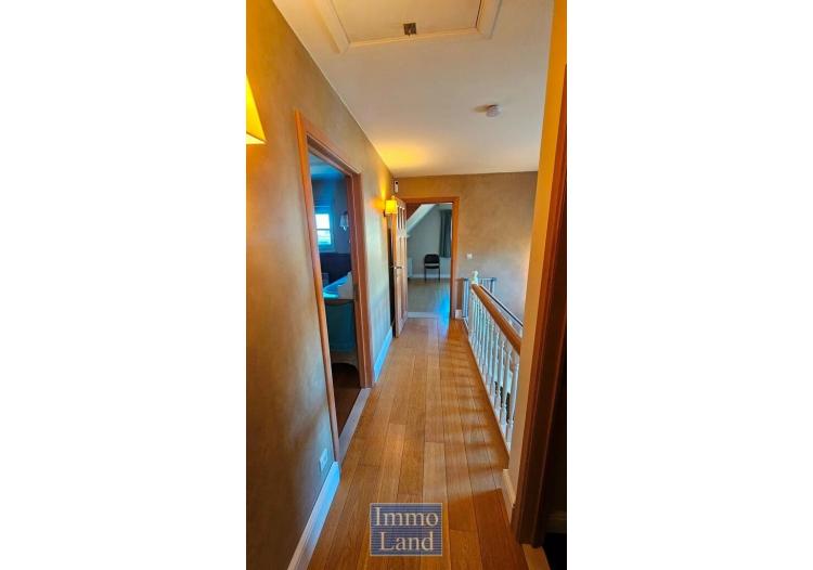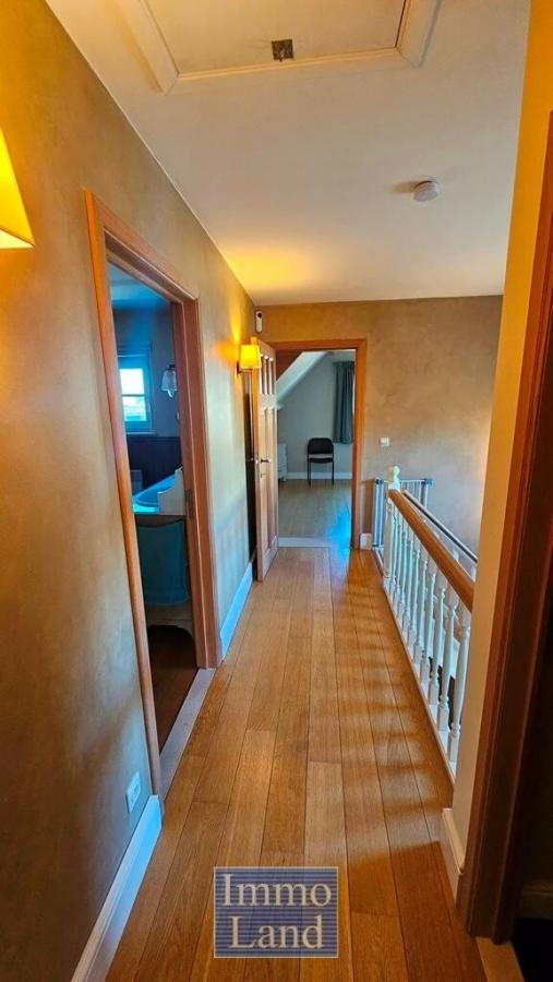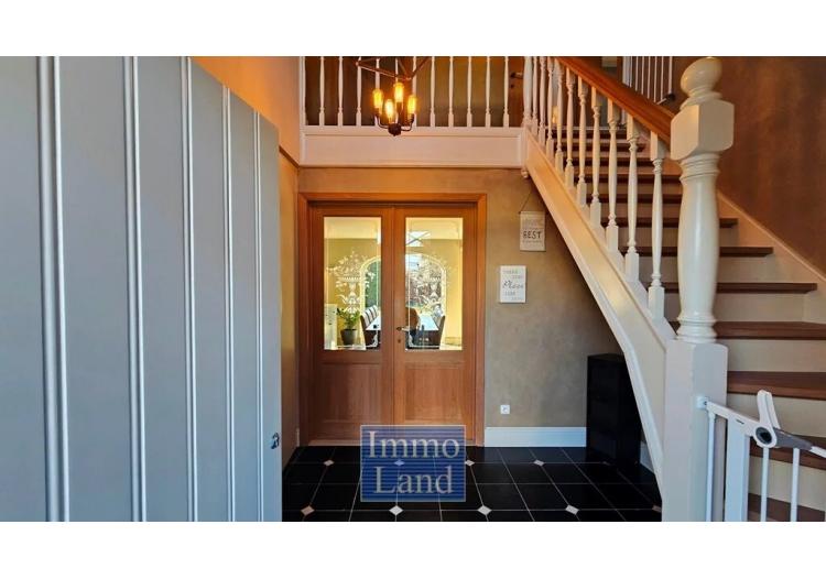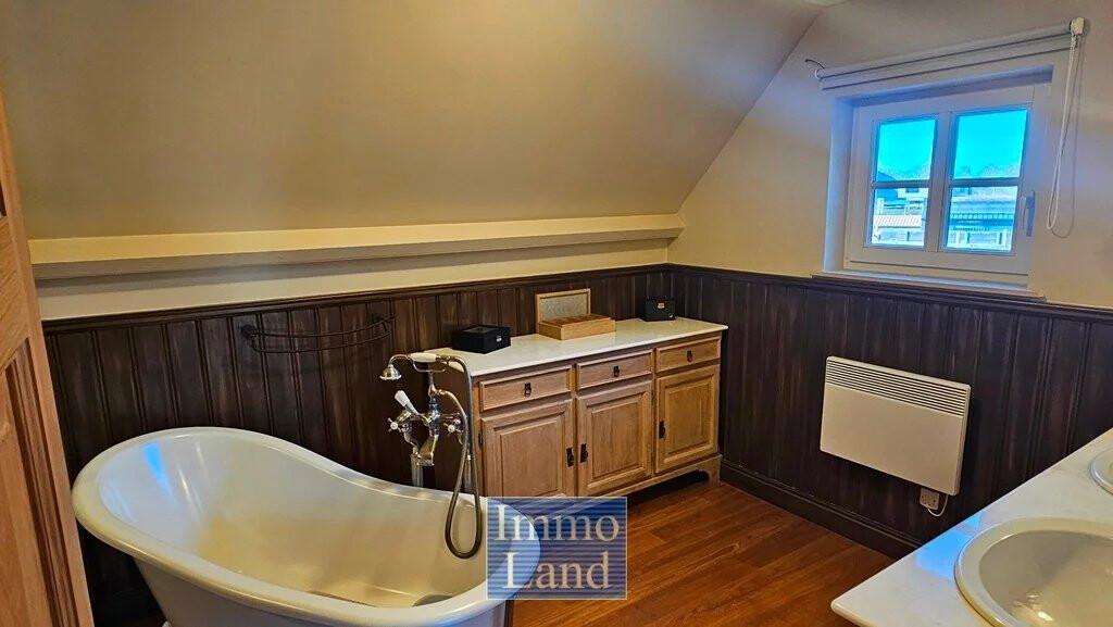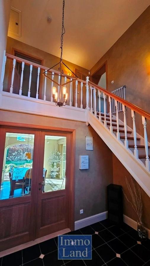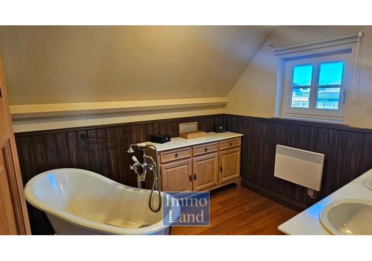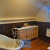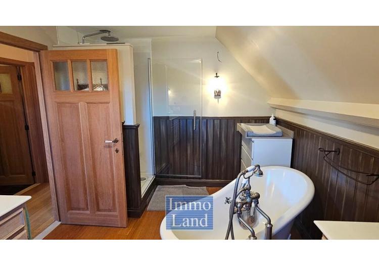 De stijlvolle trap in de ruime inkomhal geeft toegang tot de bovenverdieping. Hier bevindt zich een ruime badkamer in klassieke stijl, perfect passend bij het karakter van de pastorijwoning, uitgerust met een vrijstaand bad en een douche.