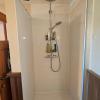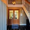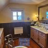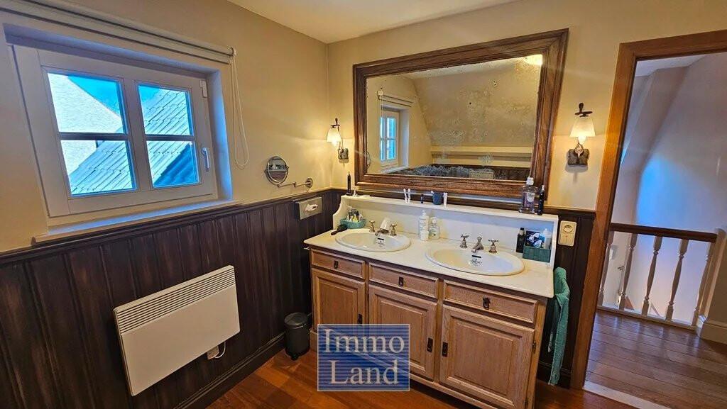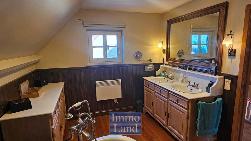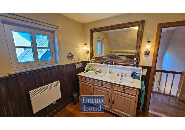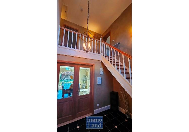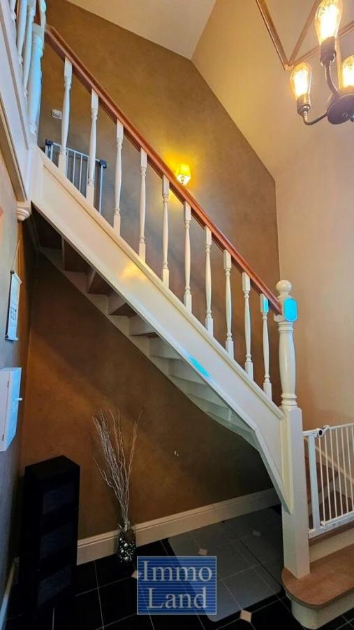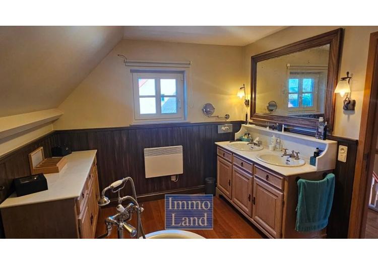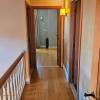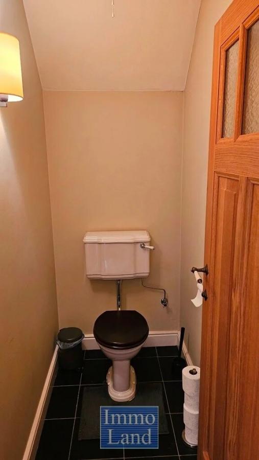 De stijlvolle trap in de ruime inkomhal geeft toegang tot de bovenverdieping. Hier bevindt zich een ruime badkamer in klassieke stijl, perfect passend bij het karakter van de pastorijwoning, uitgerust met een vrijstaand bad en een douche.