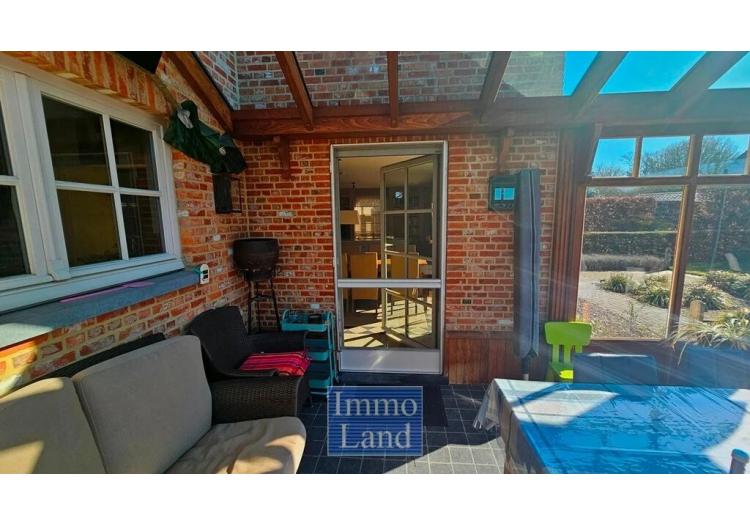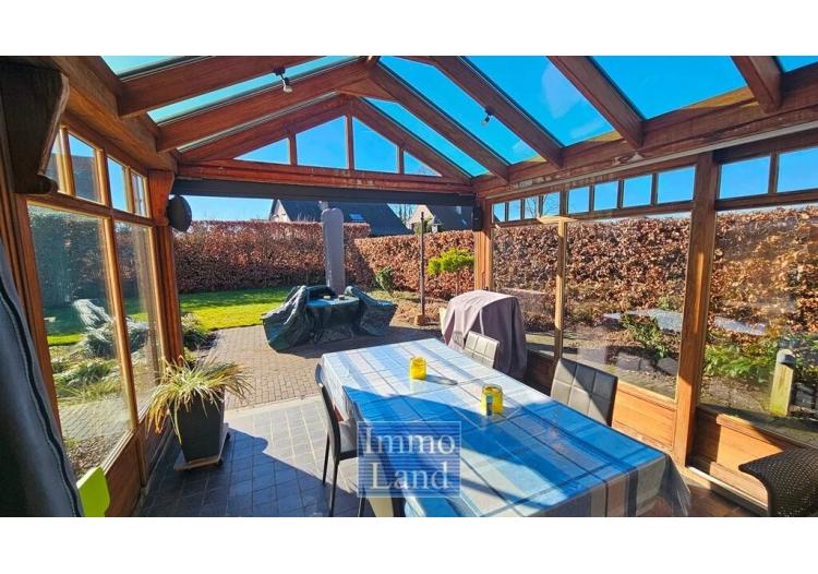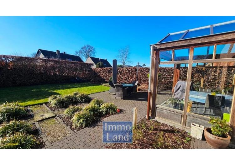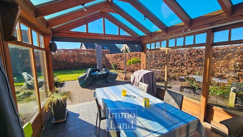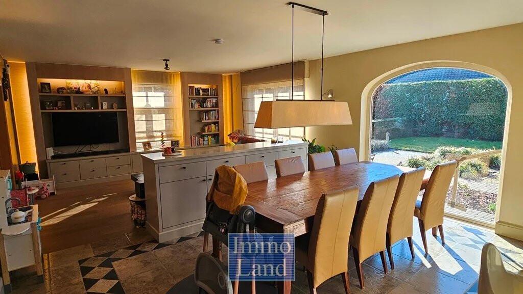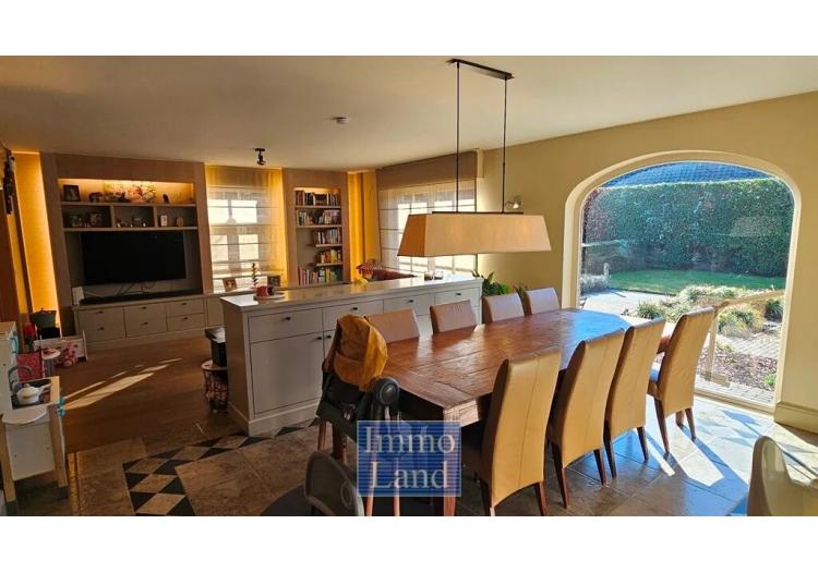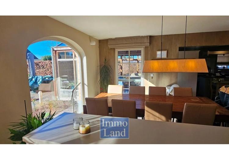 De woning geniet van een ideale zuidoriëntatie, waardoor de leefruimtes baden in natuurlijk licht. Zowel de woon- als eetkamer geven rechtstreeks uit op de tuin.